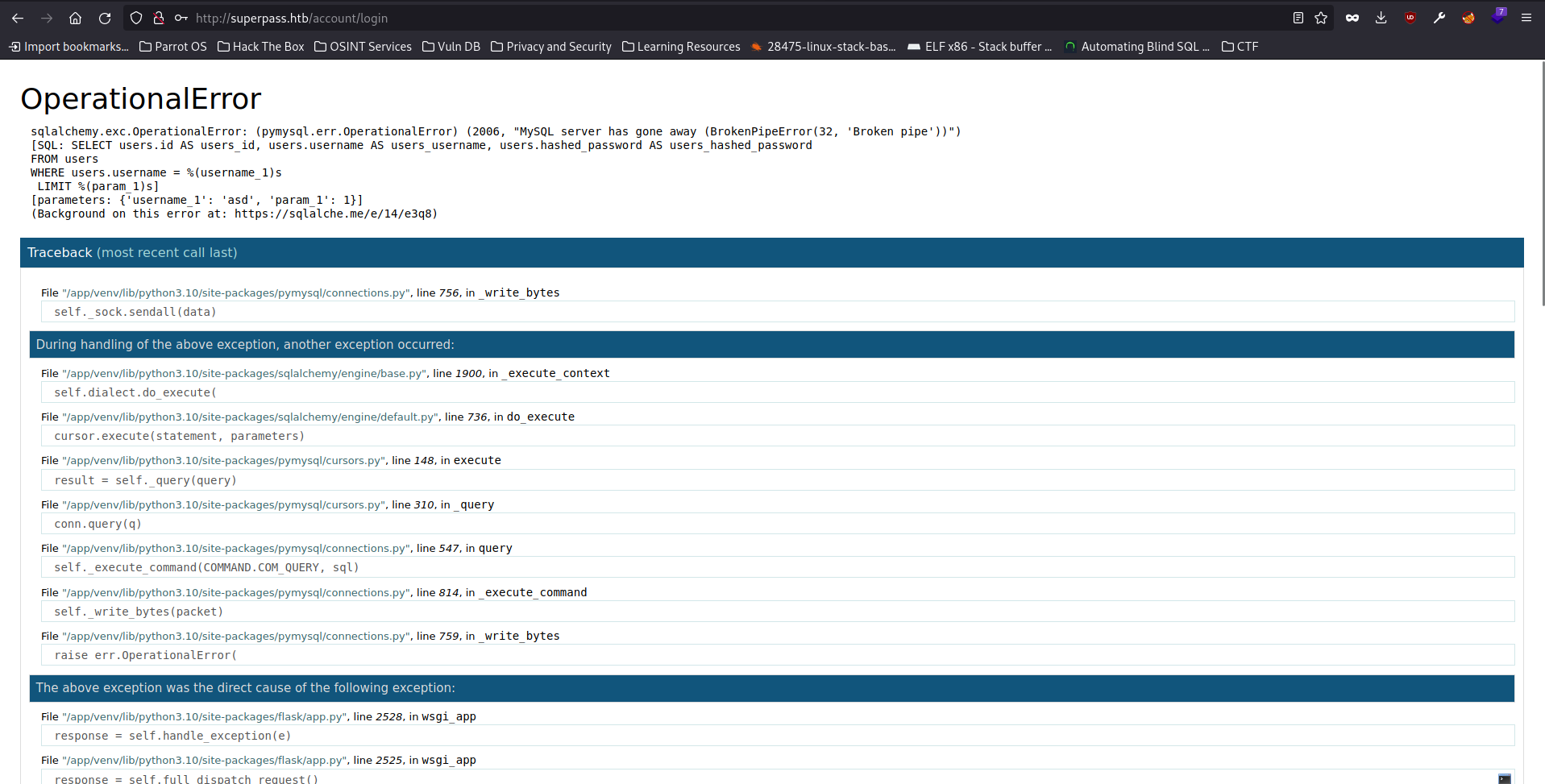 A failed login results in this error. So this is an application written with Python Flask with SQL Alchemy. These two often comes with each others.
