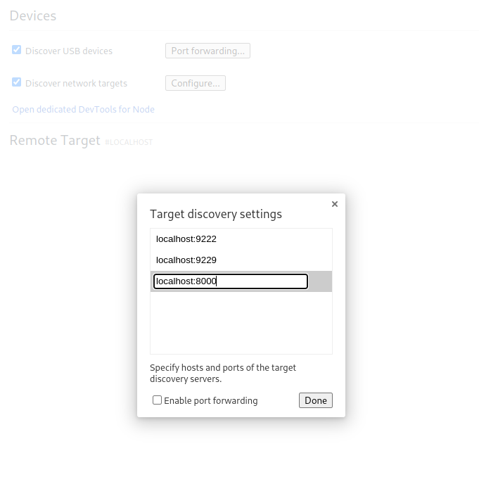 At chrome://inspect/?search=discover#devices, add our port 8000 to the network targets