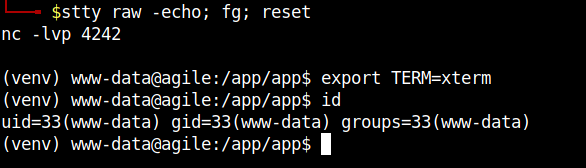 python -c 'import pty; pty.spawn("/bin/bash")', thenCtrl + Z,stty raw -echo; fg; resetthenexport TERM=xtermMore details here